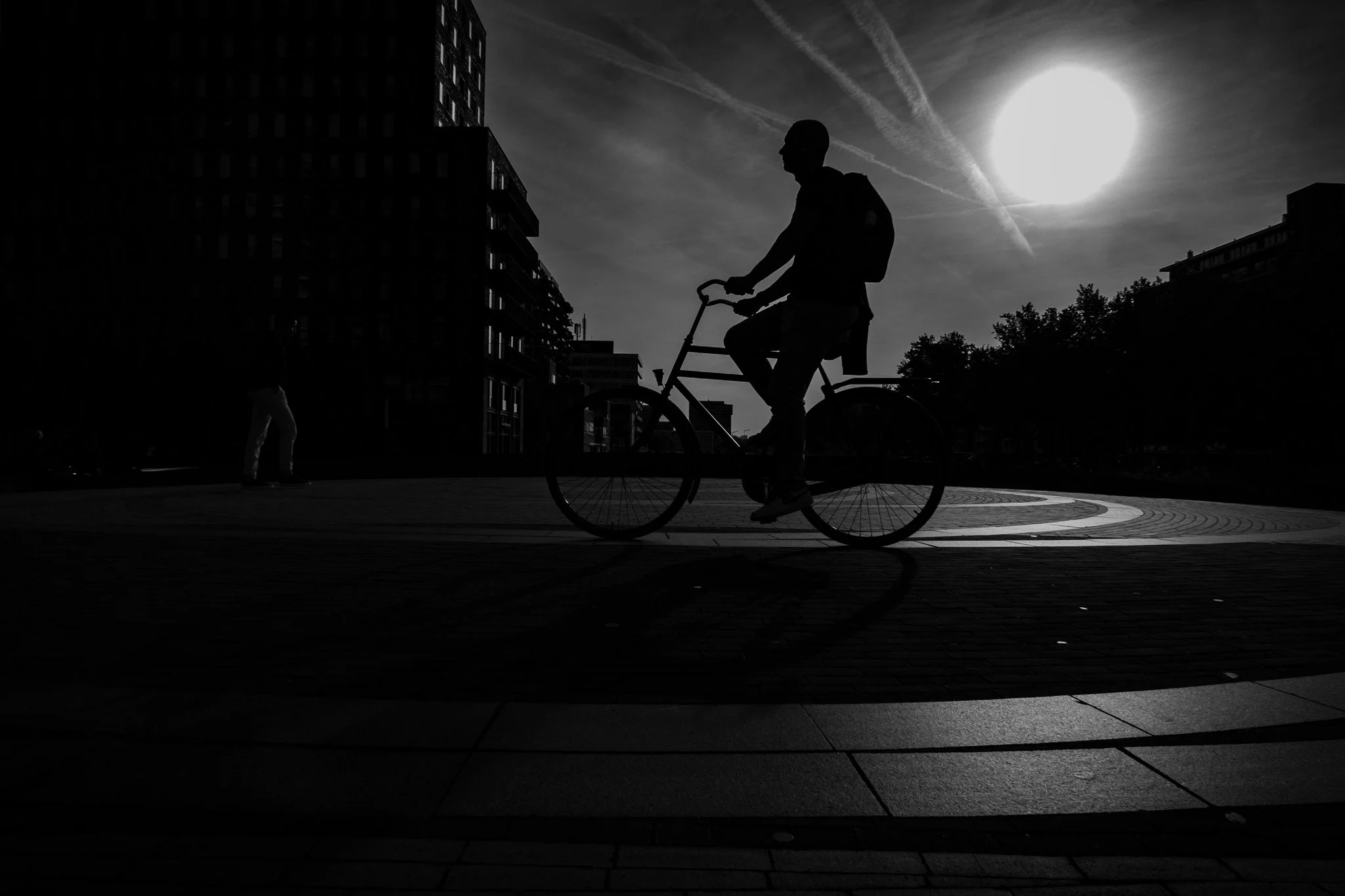 A lone rider cuts across a circle of light, briefly eclipsing the day.