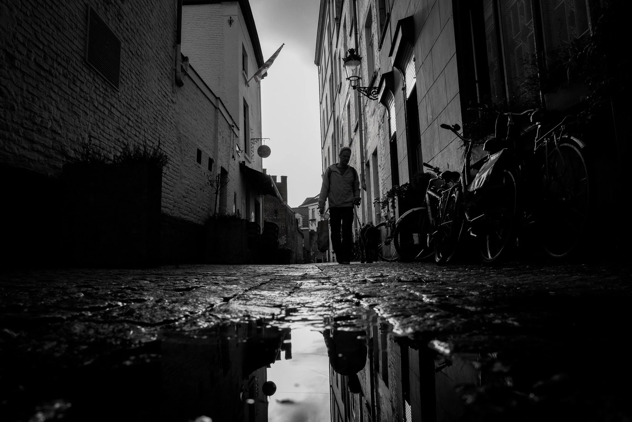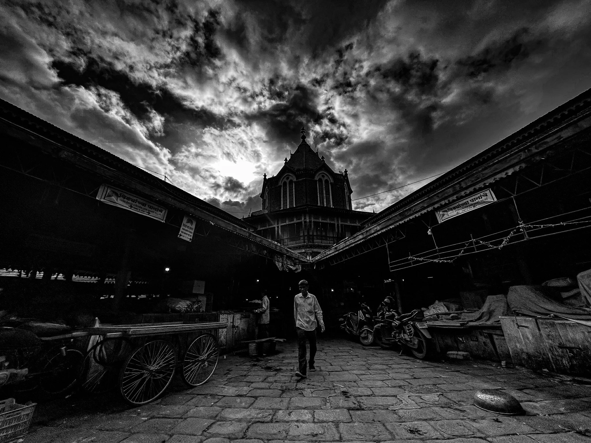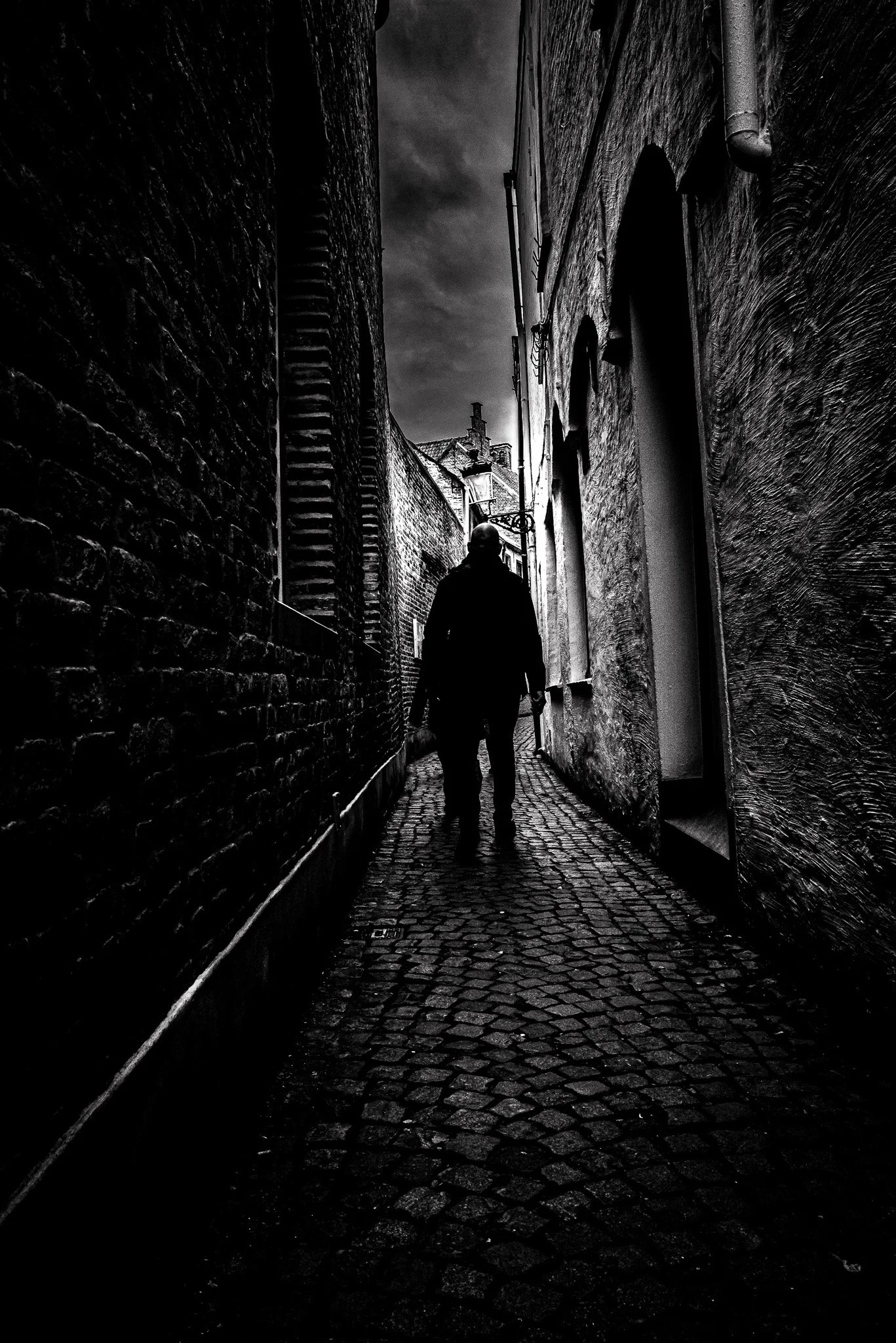 A single man crosses beneath a sky that feels heavier than the city below.