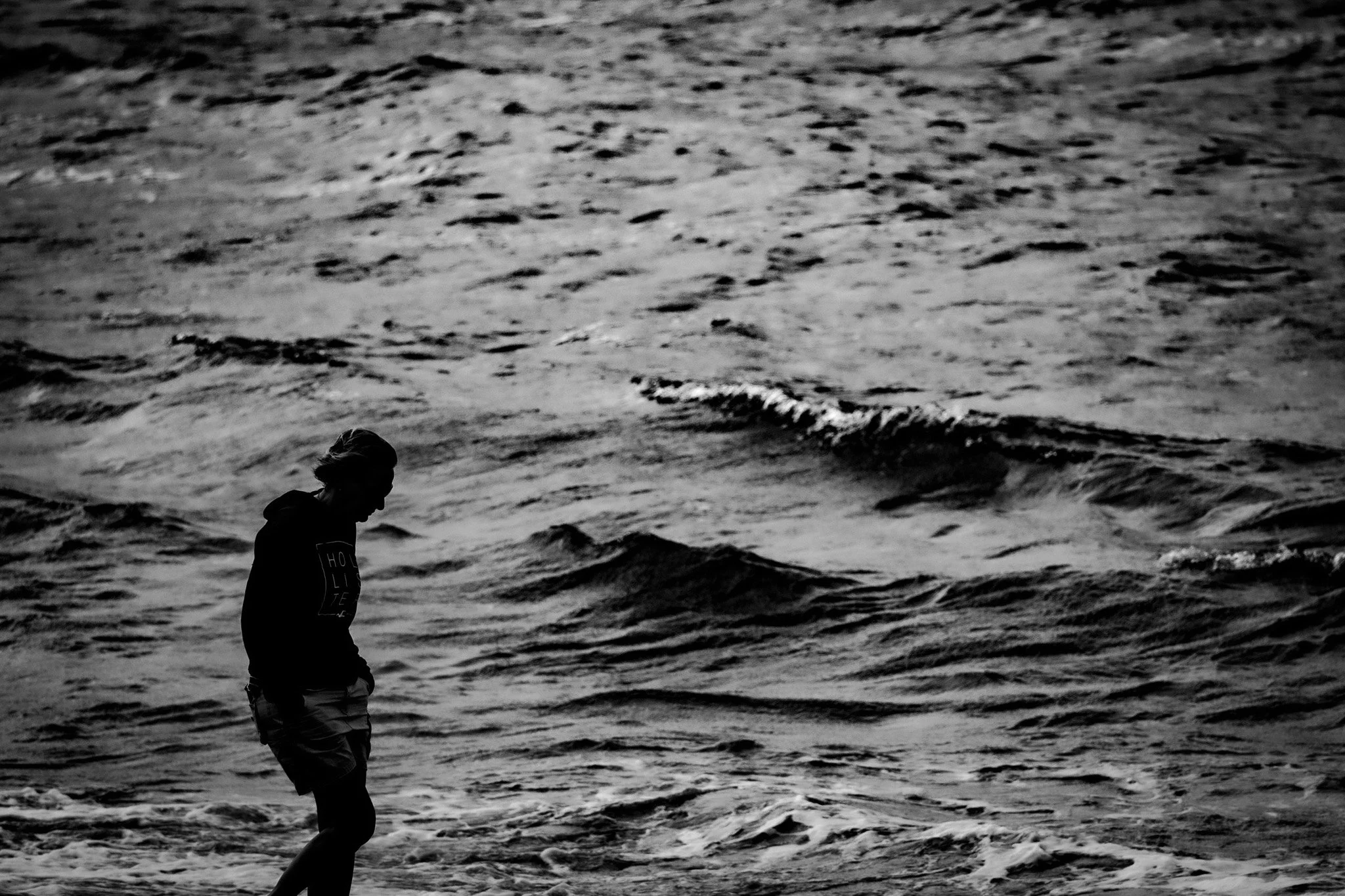 A dark silhouette walks beside restless water, dwarfed by motion.
