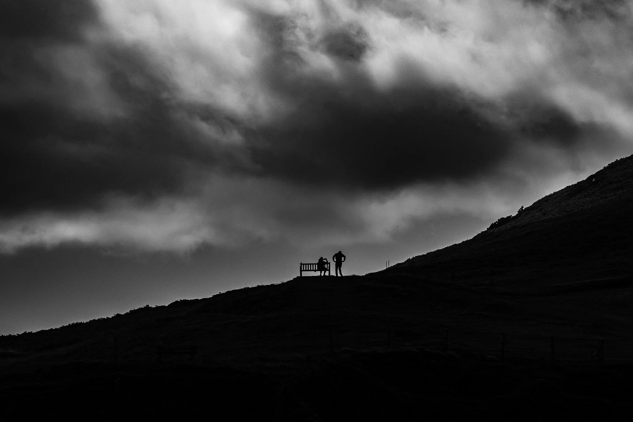 Two figures pause on the ridge where land meets weather and nothing holds them in place.