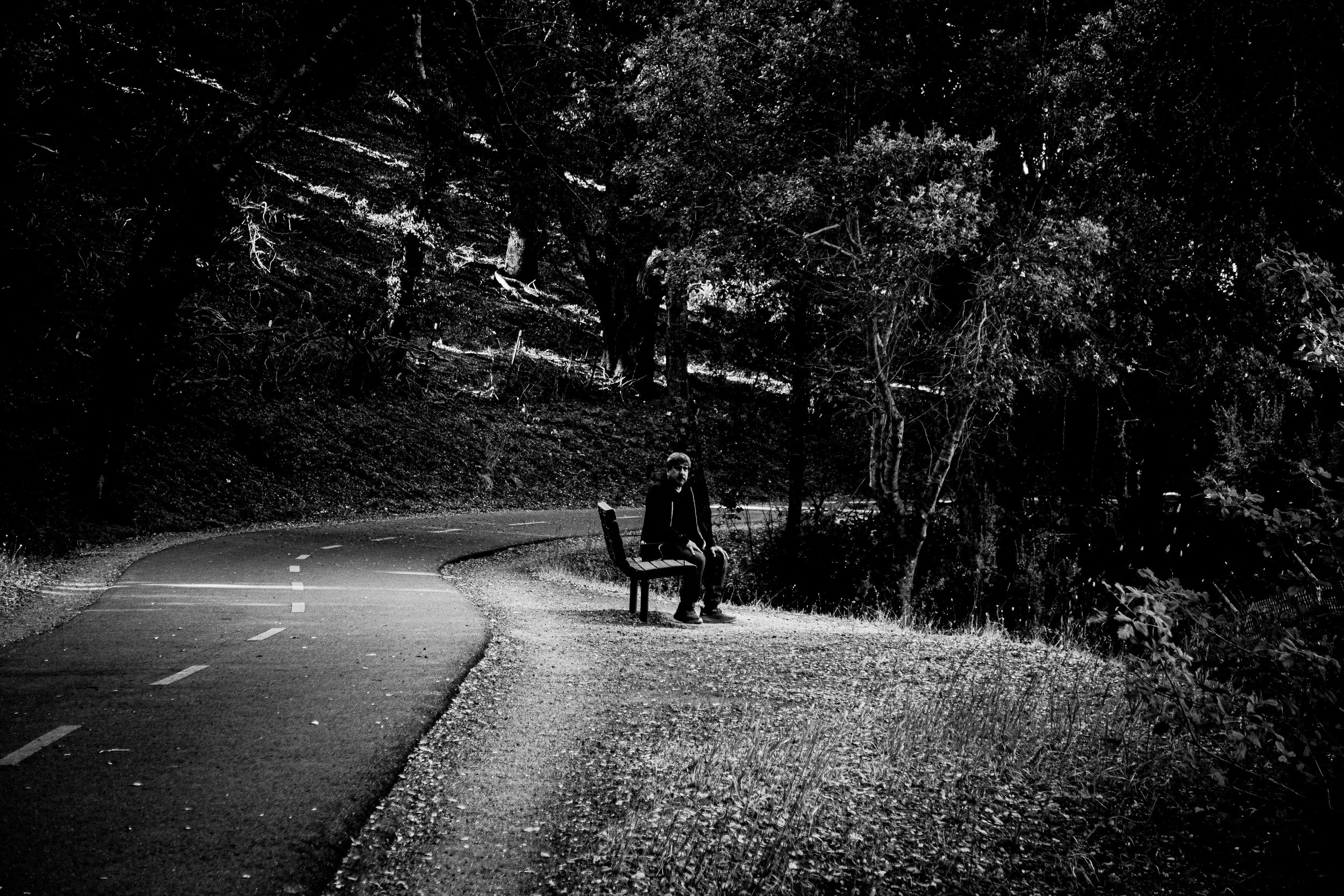 Positioned beside movement but not part of it, the subject exists in a moment of pause. The road suggests direction, but the figure remains still. The photograph reflects emotional and physical transition.