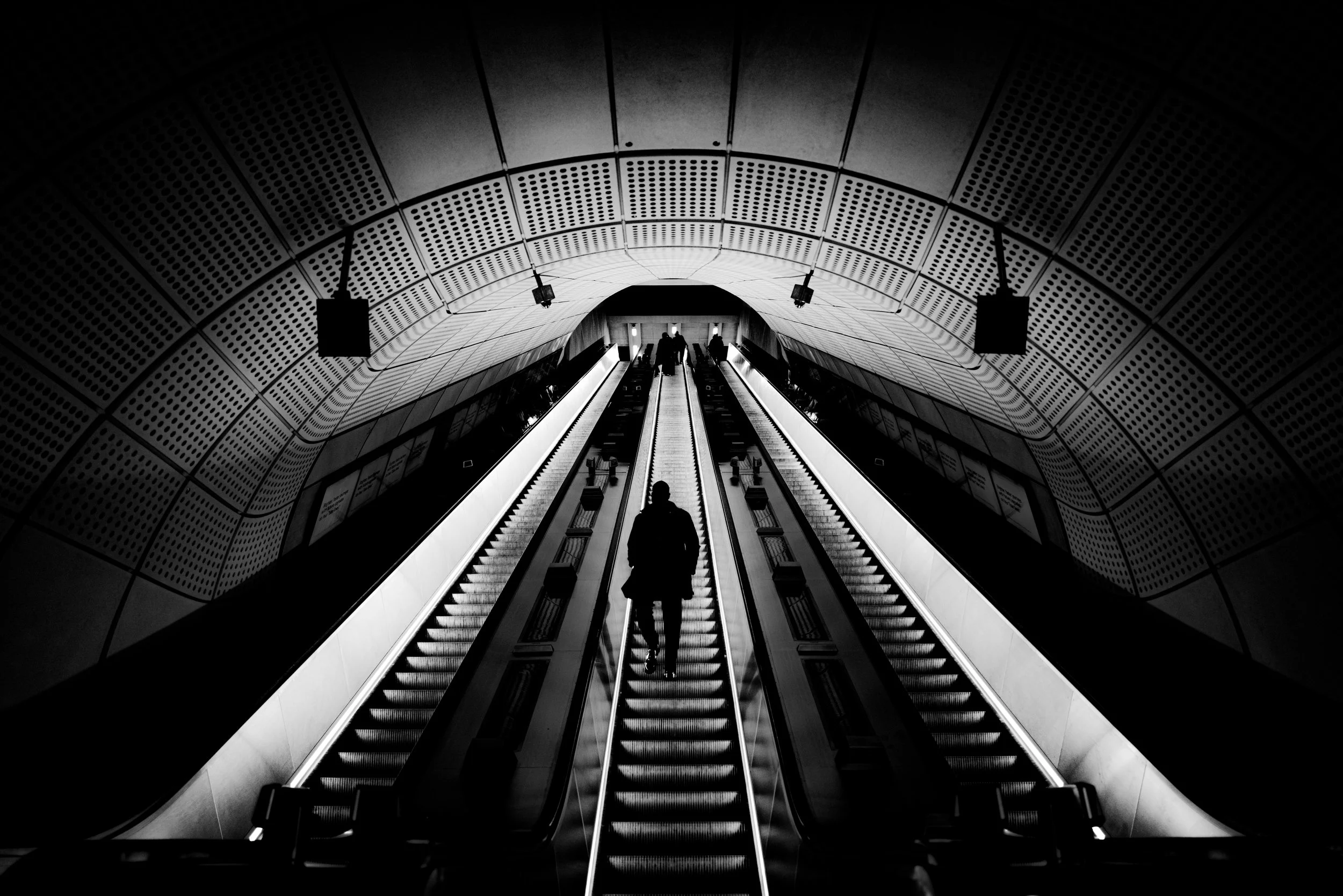 The figure moves upward, alone within the structure that surrounds him. The architecture guides his direction, but not his emotional state. Suspended between levels, he exists in a moment of transition, separated from both origin and destination. The photograph reflects the quiet solitude that accompanies movement through modern spaces, where individuals pass through environments designed for function, not connection.